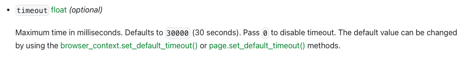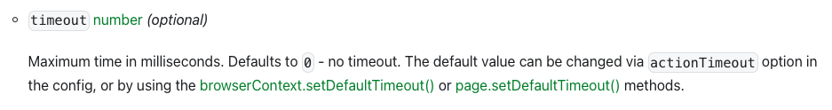 0 als Wert eines Timeouts bedeutet nicht einen Timeout von 0 Sekunden (also dass Playwright überhaupt nicht wartet), sondern dass der Timeout nicht gesetzt ist: